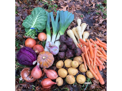 Salad greens, kale and other cooking greens, all types of onions, shallots, garlic, carrots, red yellow and fingerling potatoes, delicata, acorn, kabocha and many other types of squash, broccoli, cauliflower, romanesco. cabbage, leeks, brussels sprouts, celery, celery root, parsnips, beets, turnips, radicchio, kohlrabi and other fall winter goodies.